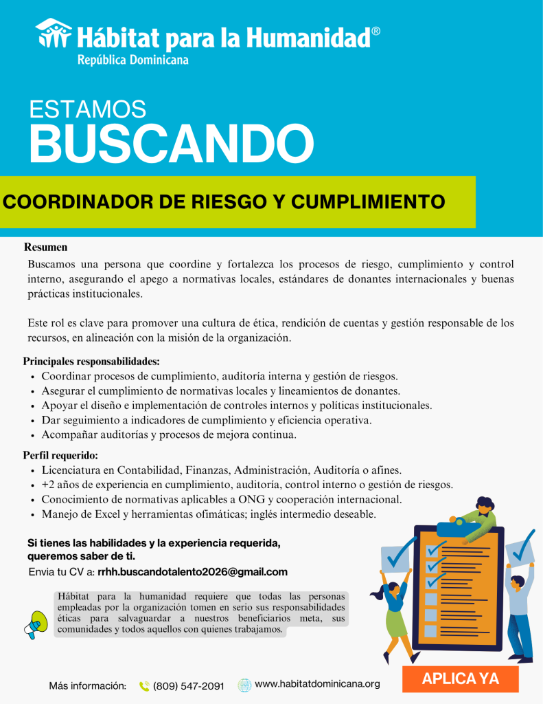 Buscamos una persona que coordine y fortalezca los procesos de riesgo, cumplimiento y control interno, asegurando el apego a normativas locales, estándares de donantes internacionales y buenas prácticas institucionales.